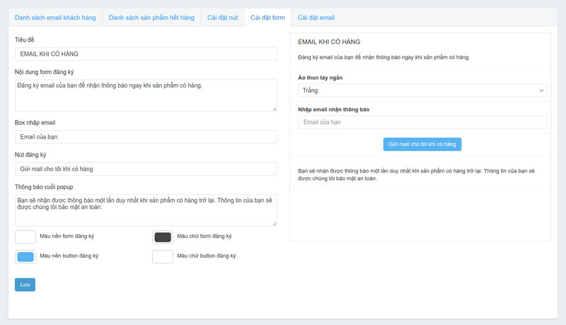 Cũng trên giao diện, bạn chuyển sang tab Cài đặt form để nhập tên sản phẩm và các thông tin khác. Nhấn Lưu để lưu lại toàn bộ tùy chọn.