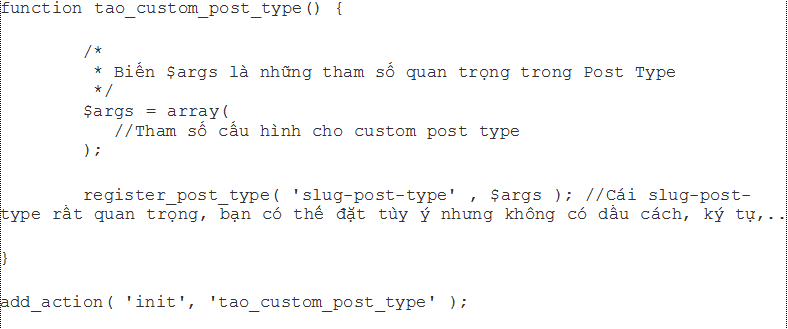 Trong hàm tao_custom_post_type() sẽ có một hàm để khởi tạo costom post type với các tham số khai báo, bạn sẽ khai báo chúng trong biến $args là được.