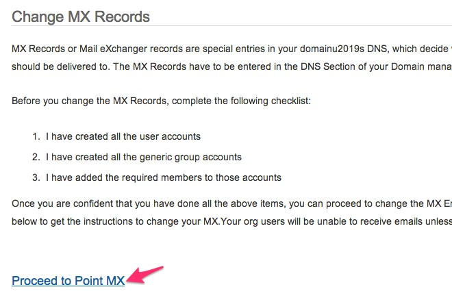 Có bảng hiện ra bạn cứ ấn “ Next” đến khi trên bảng hiện lên “Proceed to Point MX” thì ấn vào đó để thiết lập lại DNS. Bước này rất quan trọng bởi bỏ qua bạn sẽ không nhận được mail gửi đến địa chỉ theo tên miền. Sau đó kéo xuống chọn “ Next” cứ tiếp tục đến khi bảng hiện “ Done” để hoàn thành.