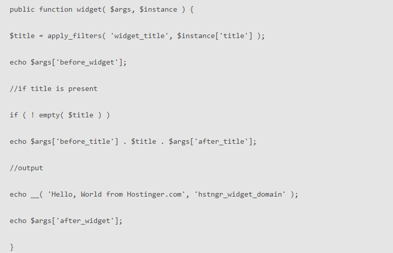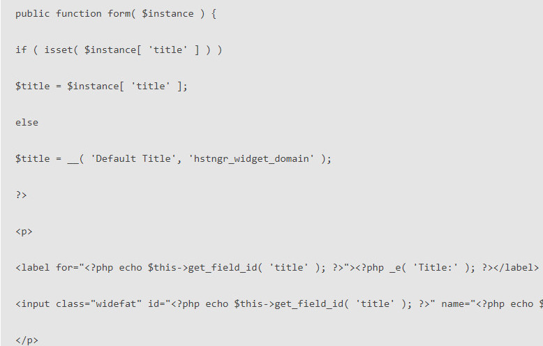 Ở đây, cấu hình đầu ra Widget sẽ hiển thị “Hello World” và hiển thị toàn bộ tiêu đề Widget theo yêu cầu của từng người dùng. Vì vậy, các bạn có thể bắt đầu lập trình cho Widget bằng cách sử dụng hàm form ().