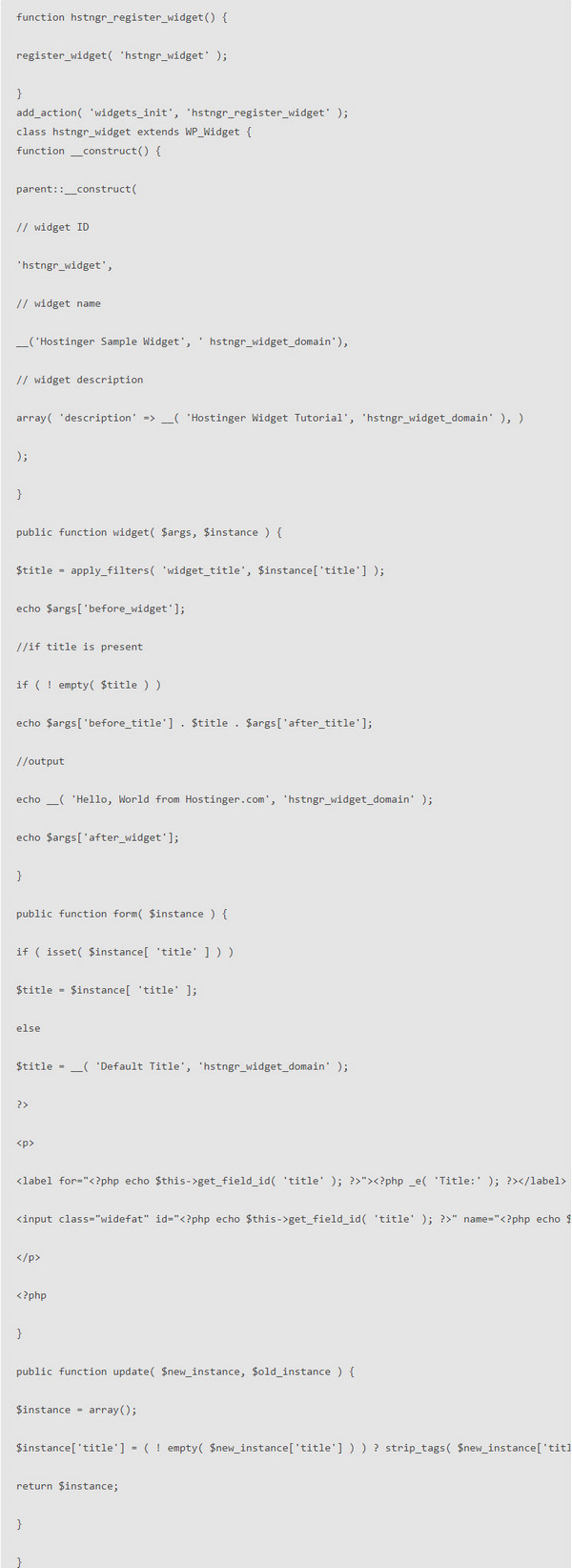 Bạn có thể bắt đầu viết code tạo Widget WordPress trong file functions.php của theme hiện đang sử dụng. Tiếp theo đó, hãy mở bất kỳ trình soạn thảo văn bản nào vào mở rộng lớp cơ sở WordPress Widget. Sau khi bắt đầu thực hiện các chức năng, các bắt bắt đầu sử dụng phương thức xây dựng để xác định một ID là tên Widget trong phần UI và mô tả.