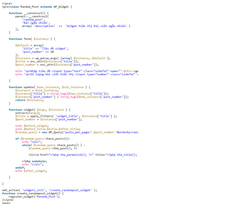 Nếu như bạn đã biết cách tạo Widget trong WordPress miễn phí như thế nào, các bạn đã có thể bắt đầu thực hành tạo Widget hiển thị bài ngẫu nhiên. Ví dụ, bạn tạo một Widget tùy cho cho phép người dùng có thể nhập số lượng bài cần hiển thị bằng ứng dụng Query và Loop.