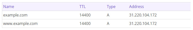 Bạn có thể tìm thấy IP address của tài khoản trong mục Details. Bạn sẽ phải tạo ra 2 A record cho tên miền: Có WWW hoặc không có. Ví dụ, example.com là tên miền mà bạn có, bạn muốn trỏ tới 31.220.104.172, các bạn sẽ phải tạo 2 Record sau đây: