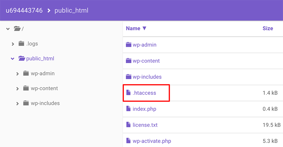 File này là file ẩn trong thư mục website nên thường được ít người biết đến. Tuy nhiên, nếu bạn đang sử dụng Hostinger File Manager thì bạn có thể dễ dàng thấy file .htaccess được cài ở chế độ mặc định.