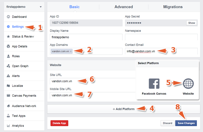 Đây là công đoạn hoàn thiện cuối cùng để tạo app facebook cho website. Với mỗi 1 face apps bạn lại có 1 id và Secret riêng biệt. Đây chính là thông tin bảo mật giúp bạn truy cập apps nhanh chóng và dễ dàng