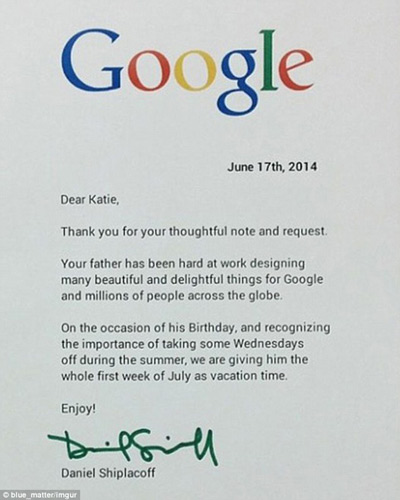 Câu chuyện lá thư này là một trong số những điều chưa biết về Google, cô bé Katie đã viết thư để gửi cho Google xin phép cho bố của cô bé được nghỉ để đón sinh nhật.