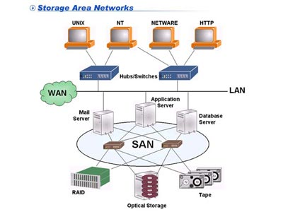 SAN là từ viết tắt của cụm từ storage area network. Đây là một giải pháp truy cập dữ liệu trên ứng dụng với nền tảng mạng theo quá trình truyền dữ liệu tương tự với quá trình truyền dữ liệu trên nhiều thiết bị khác ở máy chủ như ATA, SCSI.