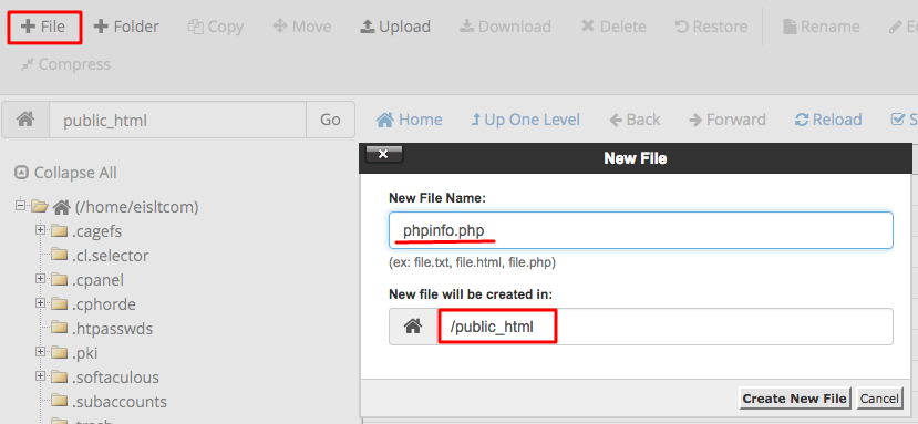 Để tạo được file này thì có rất nhiều cách, nhưng hai cách thông dụng nhất chính là tạo nó qua file Manager hoặc qua FTP client. Bạn truy cập vào hosting, sau đó chọn file Manager, nhấn chọn file Button để có thể tạo lập một file mới. Đặt tên của file này chính là phpinfo.php.